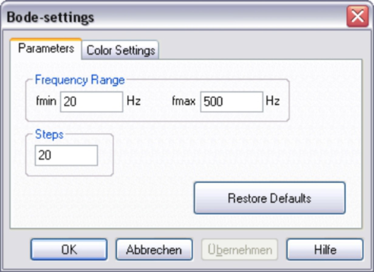 Call up the screen page "Bode Plot Parameter". This page is used to define the frequency range and the number of steps.