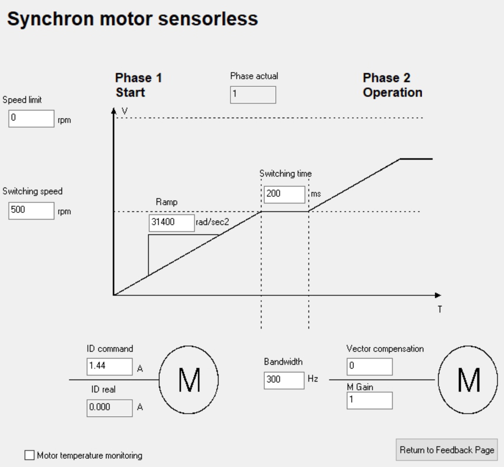 Parameters for sensorless operation can be set on the "Synchron Sensorless-Mode" menu page. The sensorless operation consists of two phases which are parameterized via the parameter SLJSWITCH (switchover threshold):