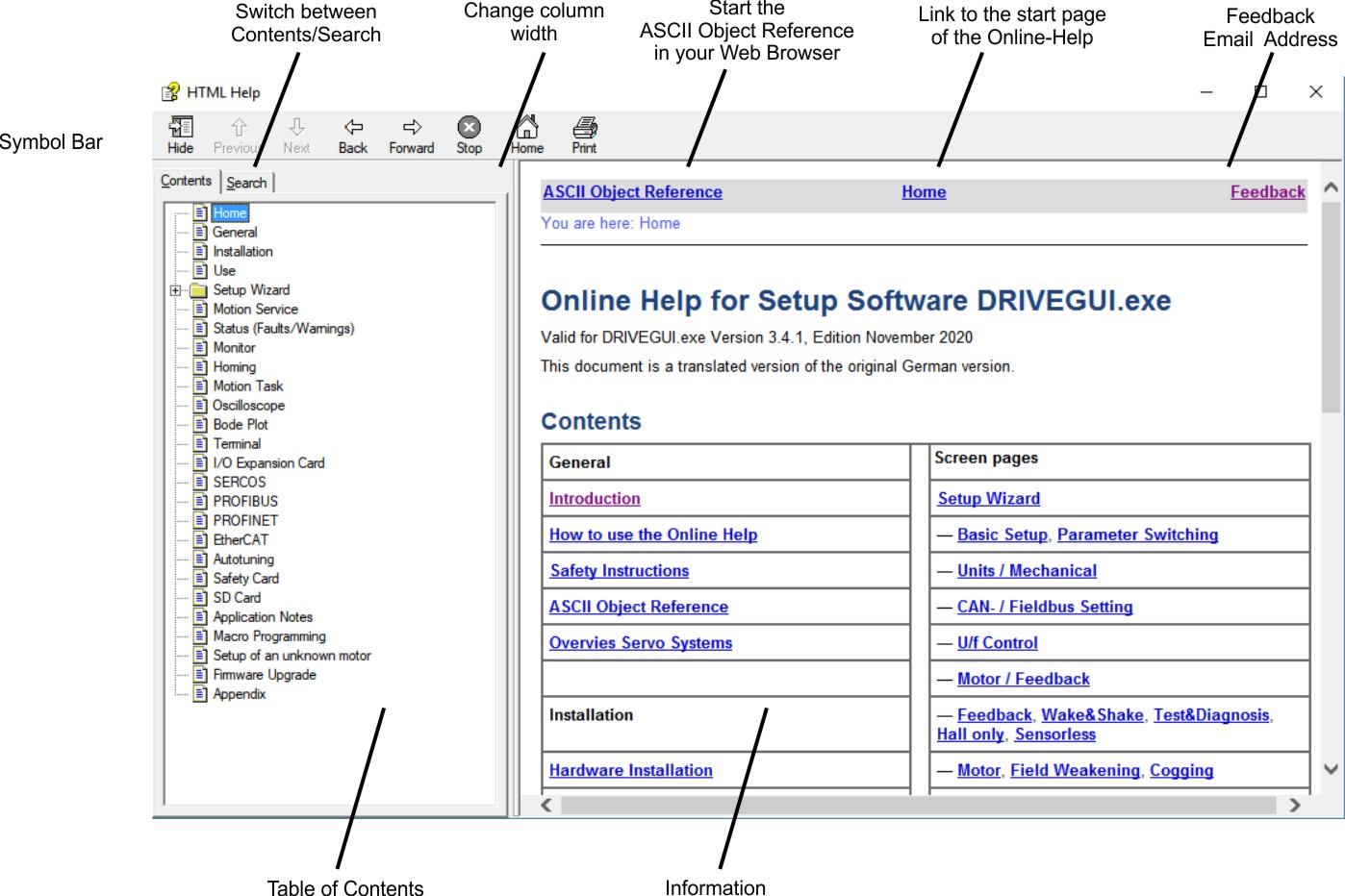 The Online-Help can be used like an Internet website with links, navigation frame and back/forward buttons.