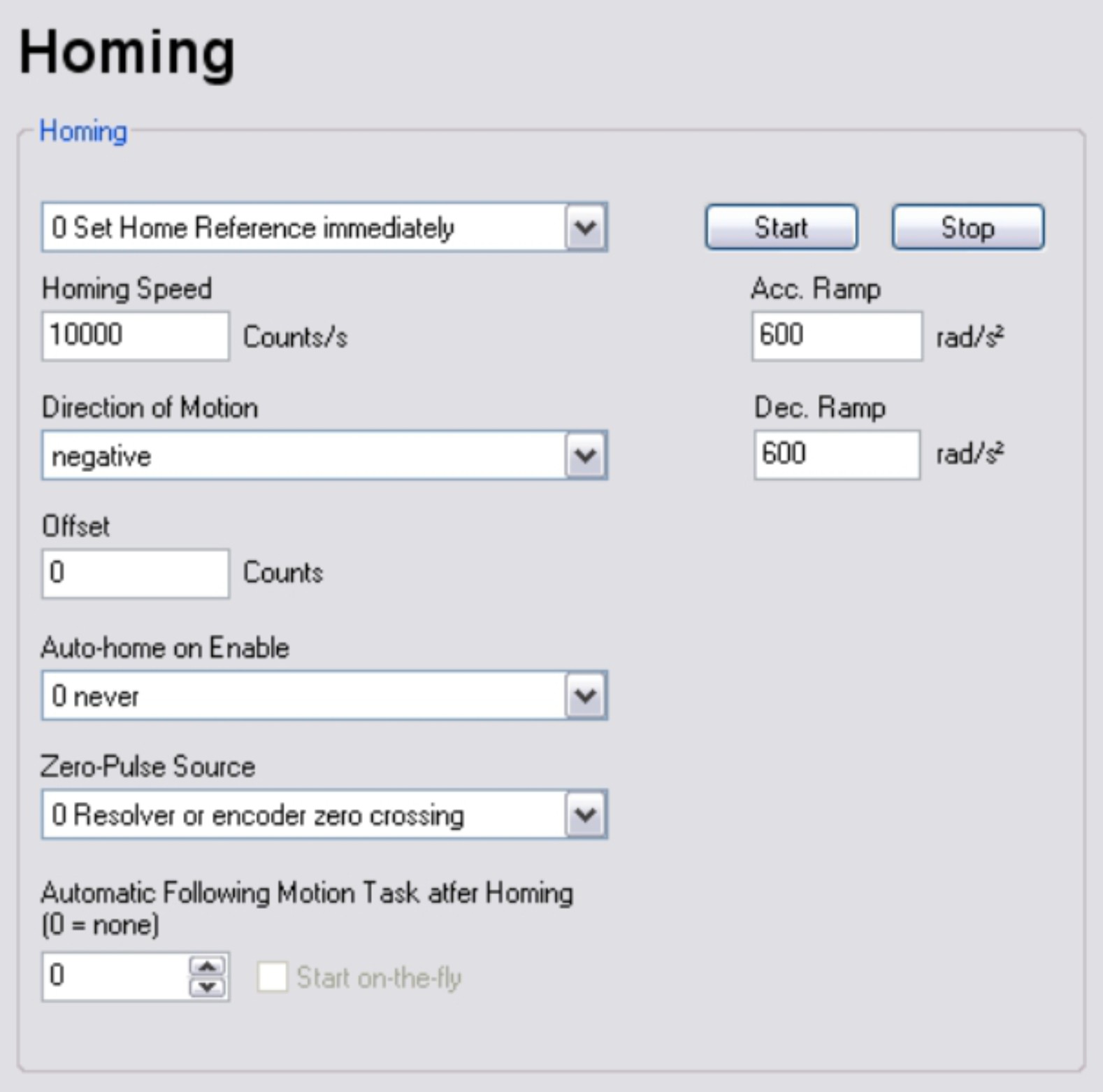 the first feedback zero-mark outside the mechanical stop. Peak current is limited to Homing Ipeak during the movement. (see screen page "Current Loop"). |