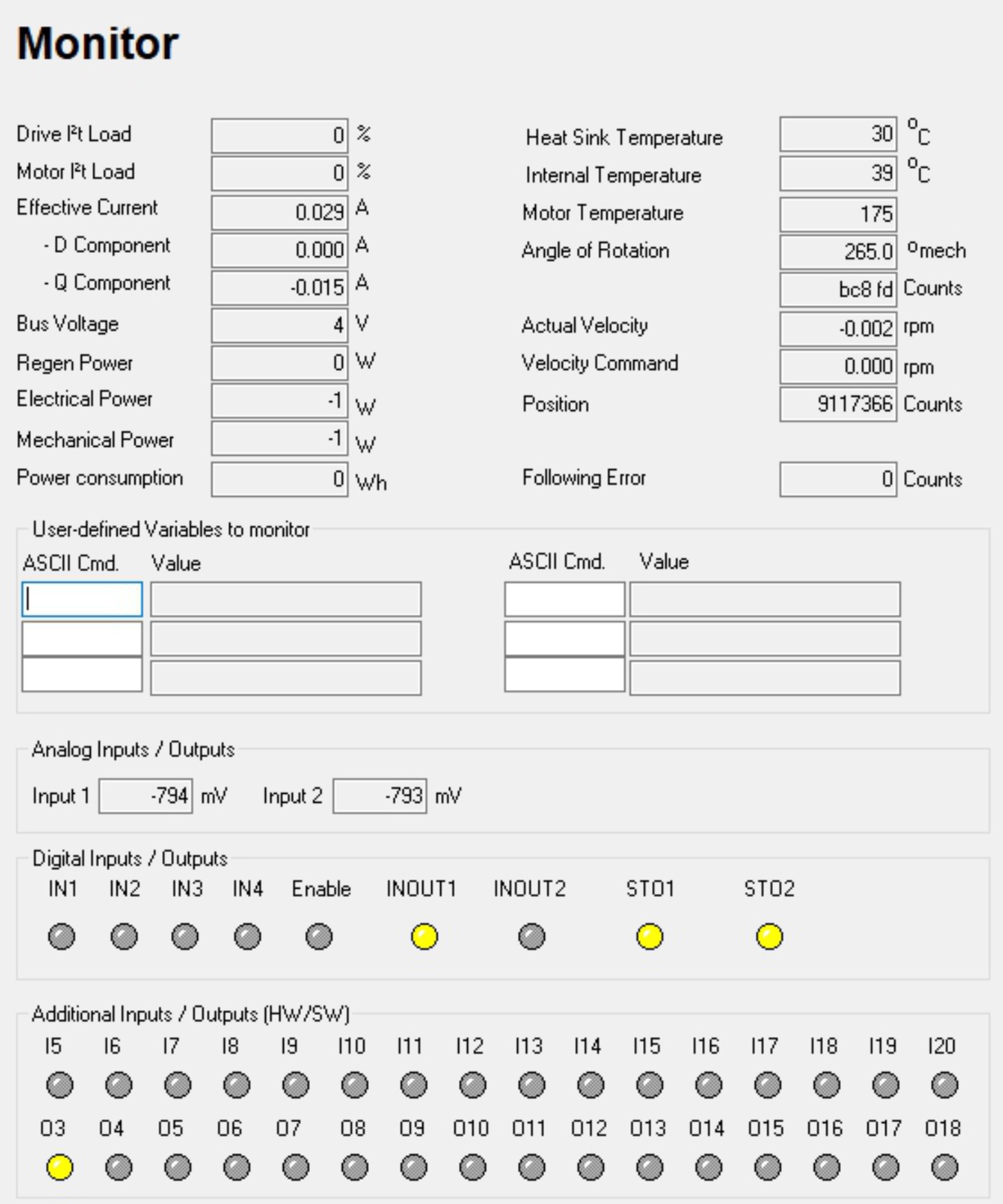 Displays the actual angle of rotation of the rotor in "°mech" or in "counts" referred to the mechanical zero point of the measuring system. Indicated is the absolute position within one turn of the motor axis. The dimension "counts" is a hexadecimal number with 20 bits accuracy (that means : 1 turn = 220-1 counts) |