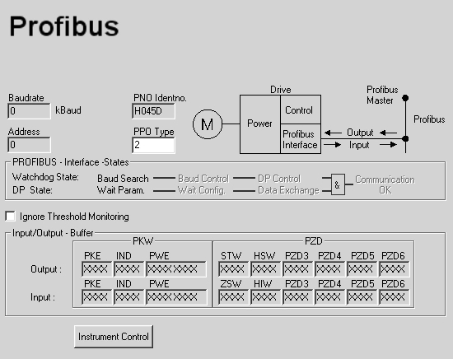 The PROFIBUS-specific parameters, the bus status, and the data words in the transmit and receive directions (as seen by the bus-master) are displayed on this screen page. This page is helpful when searching for errors and commissioning the bus communication.