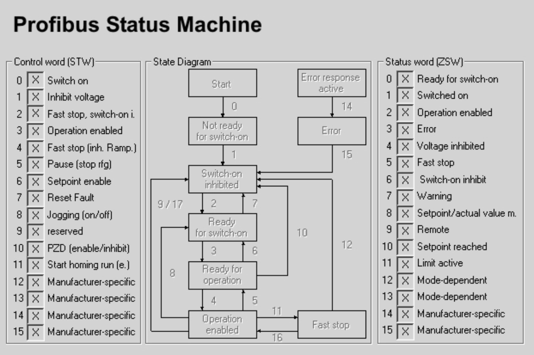 On this screen page the individual bits of the control word (STW) and the status word (ZSW) are shown. The device status resulting from the status word is visualized in the status machine. The current status is shown as black, all others are grey. Additionally the previous status is shown by emphasizing the number of the appropriate arrow.