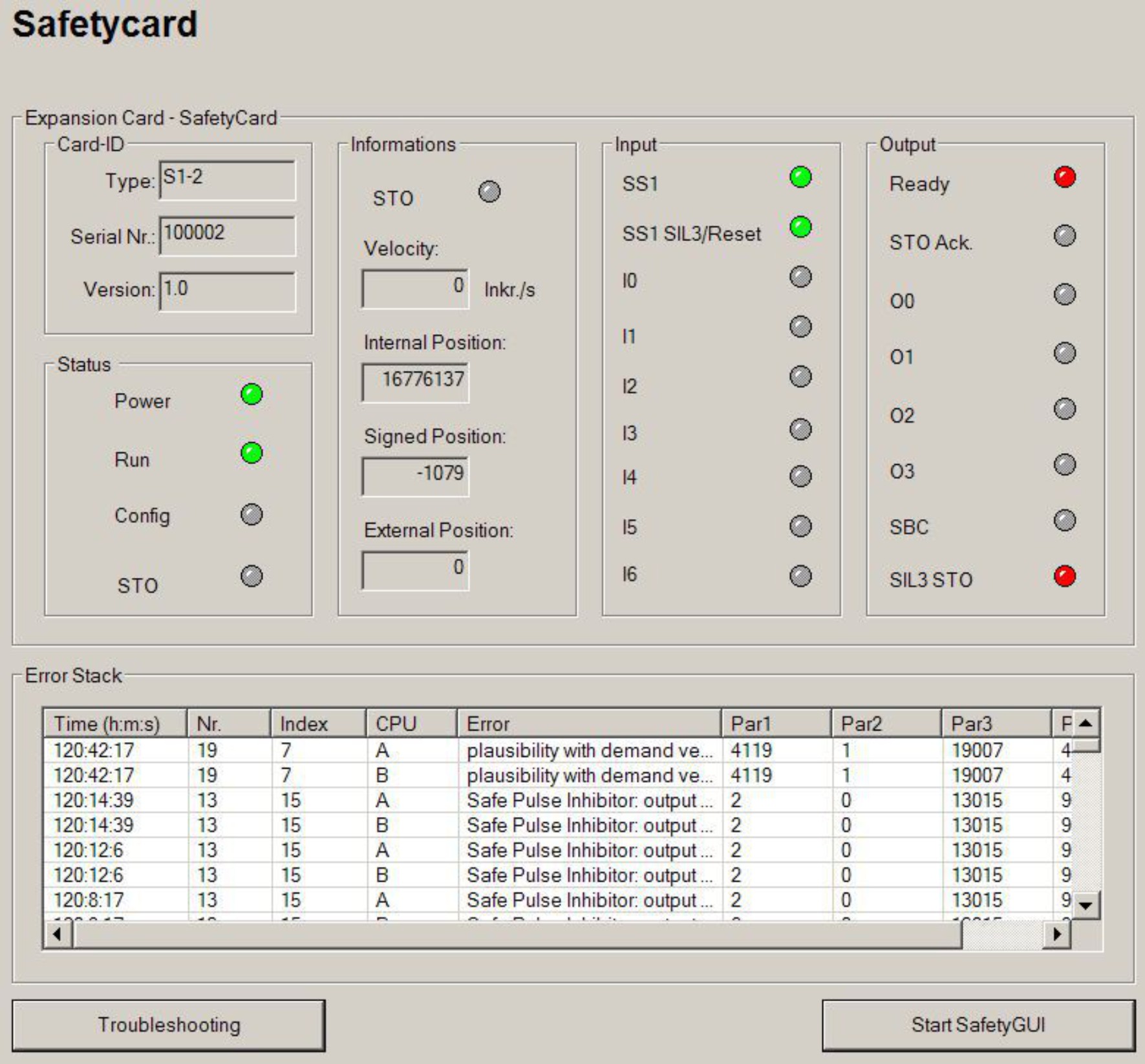 The upper area shows data of the built-in card and the current I/O state. The error stack shows a history of safety errors related to the operation time counter of the servo amplifier.
