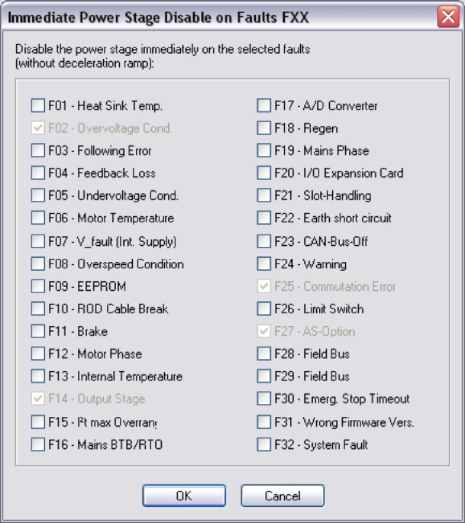 Click Button "Immediate Power Stage Disable on faults Fxx... " to define, which faults must immediately disable the power stage (bit variable ERRCNFG, see chapter Error messages).