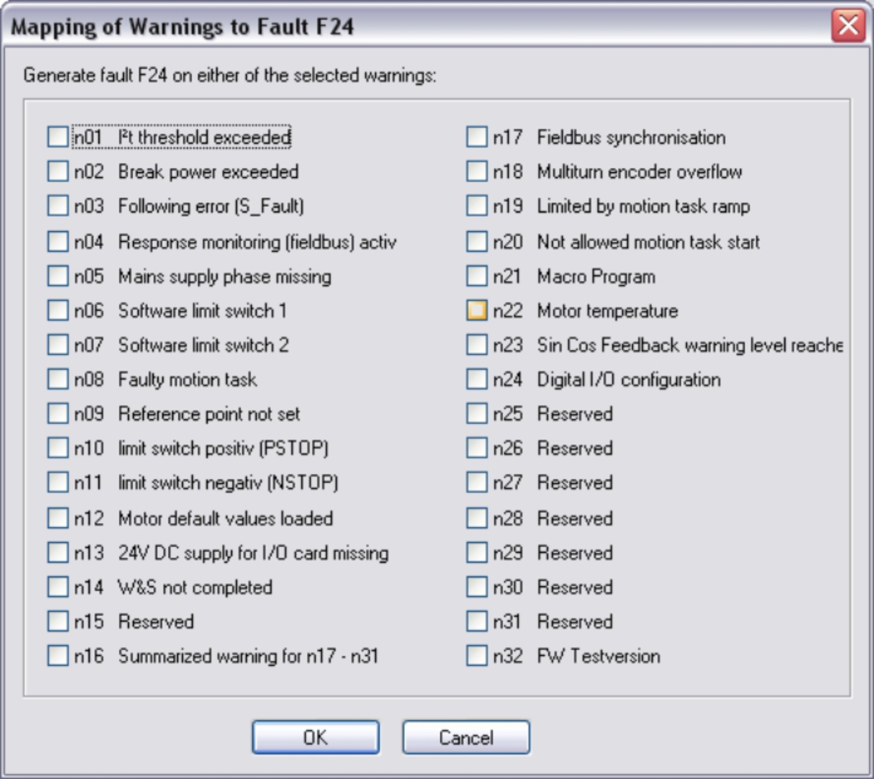 Click Button "Mapping of Warnings to Fault F24... " to define the fault message F24 (bit variable WMASK, see chapter Error- and Warning messages).