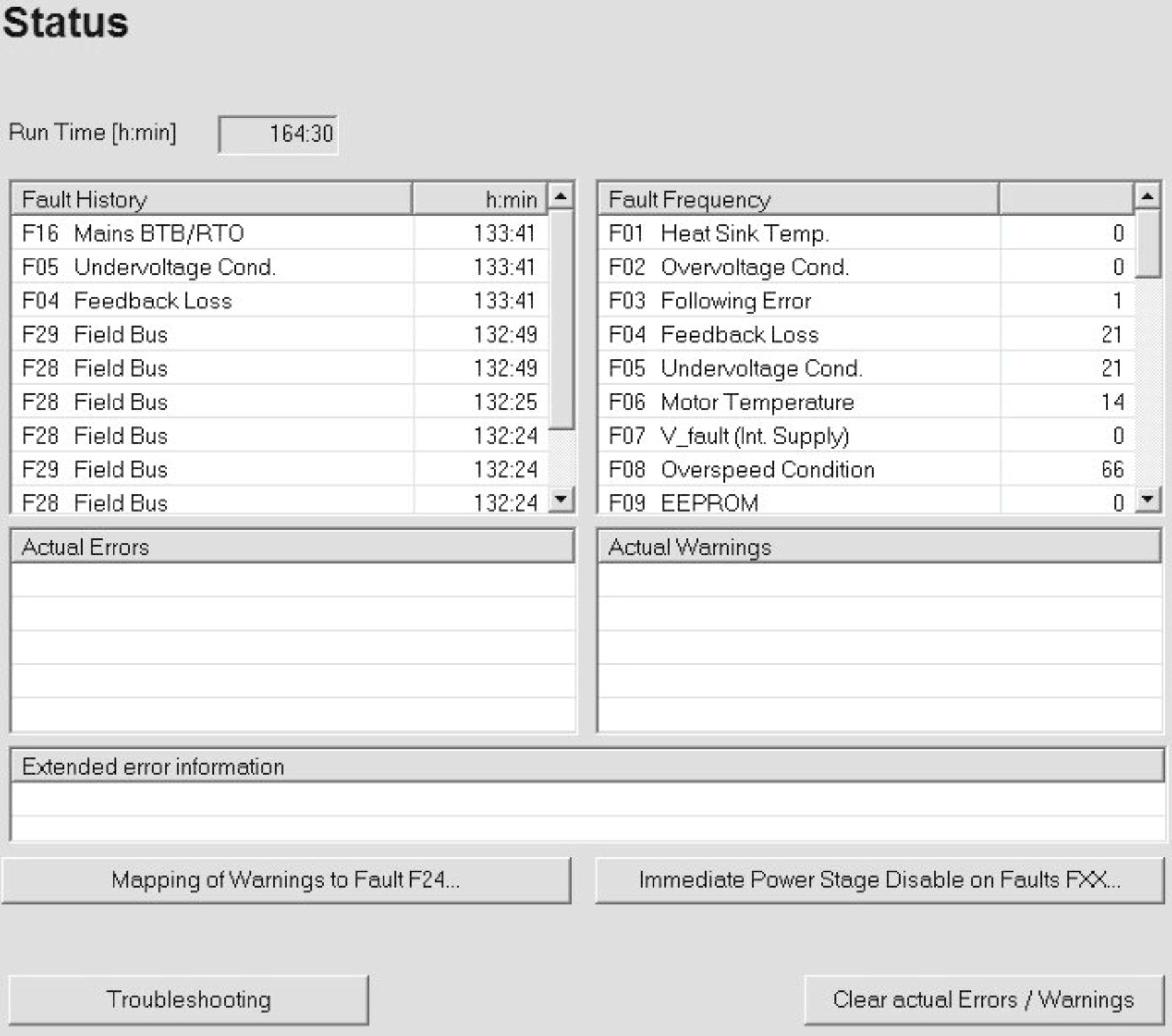 The actual fault status and the run time monitor of the servo amplifier are displayed here. Compare to the runtime status you can simply calculate when an fault occurrs.