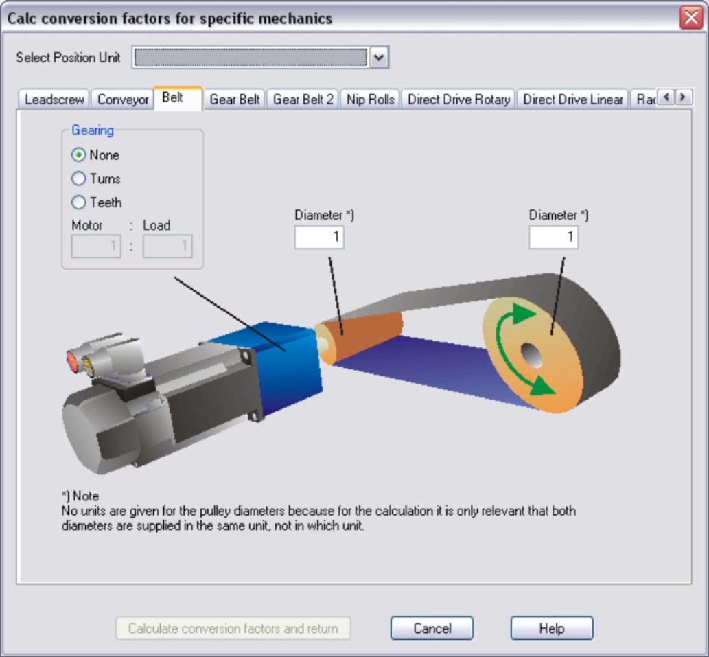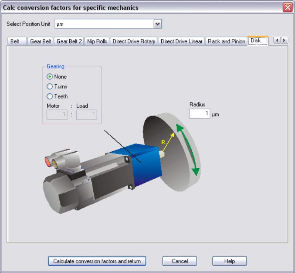 Disk Enter the radius of the mounted disk. If a gearbox is flange-mounted on the motor, you must also enter the gearbox data (either the number of teeth or the ratio of the revolutions). Then click the “Calculate conversion factors and return” button. |