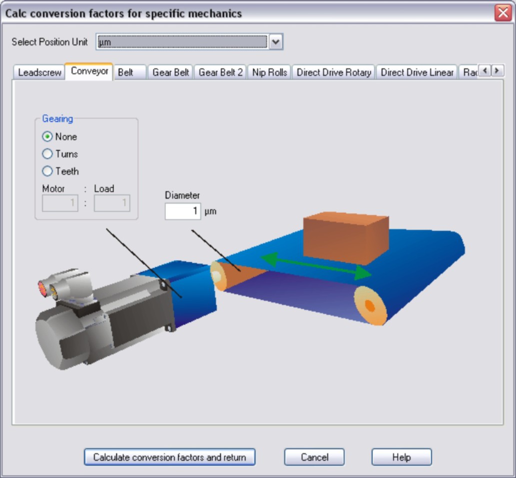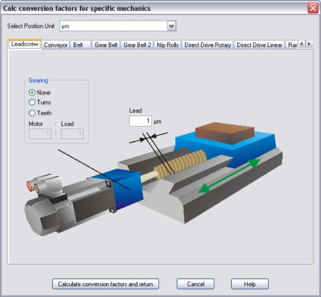 Leadscrew The load is driven via a lead screw. Enter the screw lead. If a gearbox is flange-mounted on the motor, you must also enter the gearbox data (either the number of teeth or the ratio of the revolutions). Then click the “Calculate conversion factors and return” button. |
