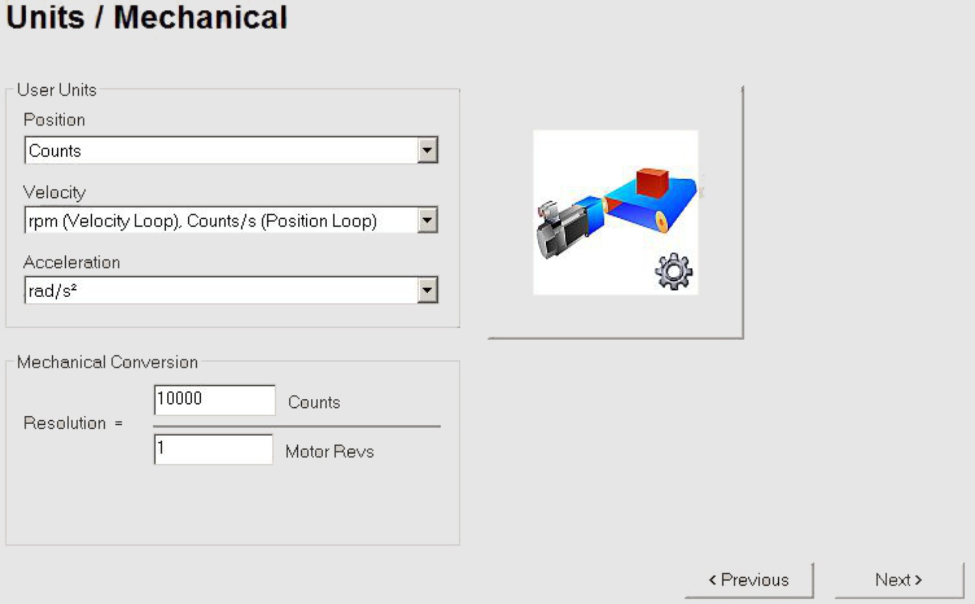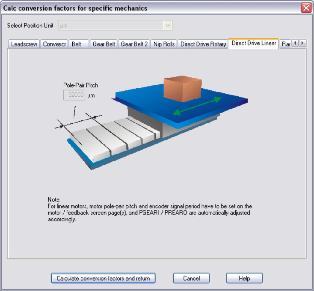 Direct Drive Linear The pole-pair width and encoder signal period depend on the device and are set on the Motor or Feedback screens. Then click the “Calculate conversion factors and return” button. |