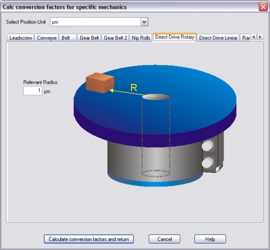 Direct Drive Rotary On selecting a length position unit, enter the appropriate radius for the route to be traversed. If the position unit is ° (degrees), you do not have to enter anything else. Then click the “Calculate conversion factors and return” button. |