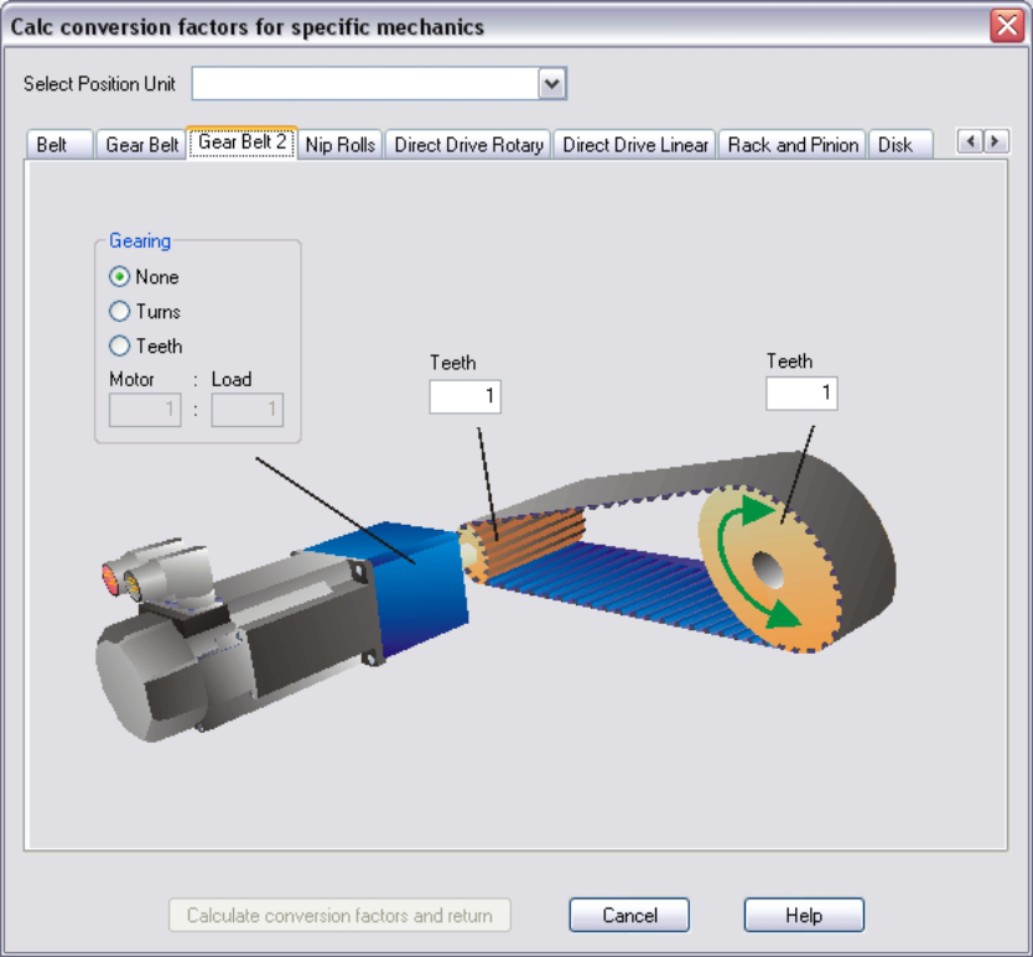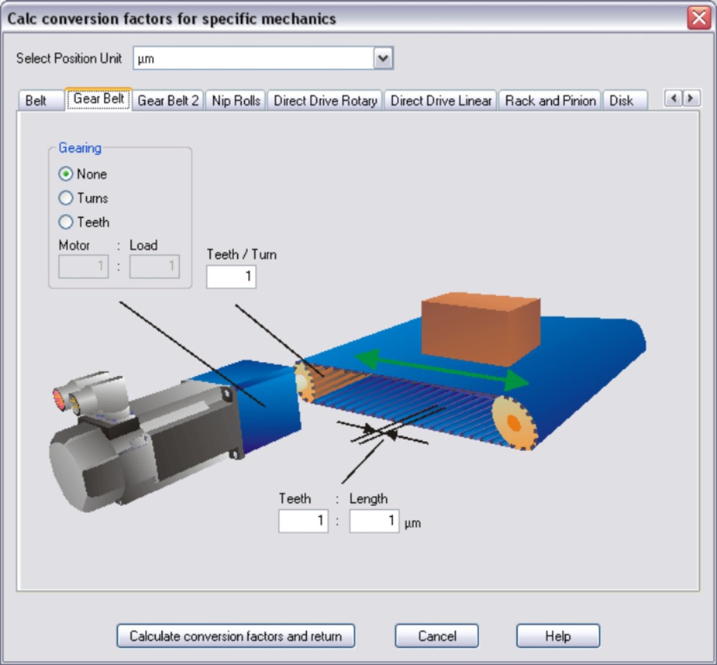 Gear Belt Enter the number of teeth per revolution of the driven gear wheel and the number of teeth per unit of length. If a gearbox is flange-mounted on the motor, you must also enter the gearbox data (either the number of teeth or the ratio of the revolutions). Then click the “Calculate conversion factors and return” button. |