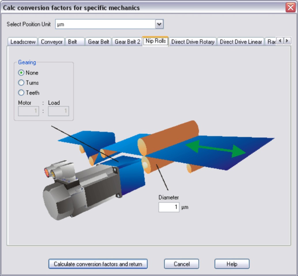 Nip Rolls Enter the driven shaft diameter. If a gearbox is flange-mounted on the motor, you must also enter the gearbox data (either the number of teeth or the ratio of the revolutions). Then click the “Calculate conversion factors and return” button. |