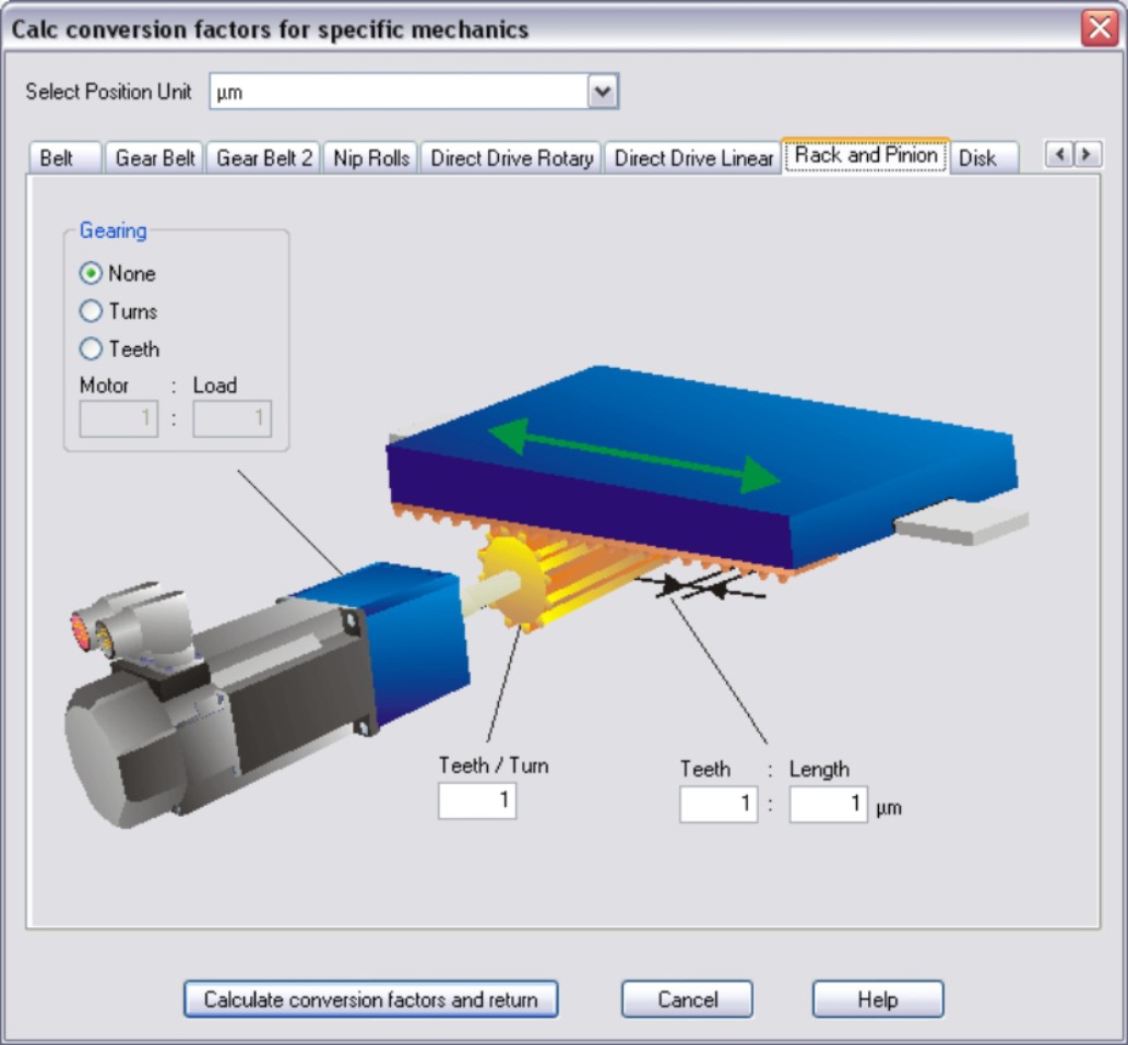 Rack and Pinion Enter the number of teeth per revolution of the driven gear wheel and the number of teeth per unit of length. If a gearbox is flange-mounted on the motor, you must also enter the gearbox data (either the number of teeth or the ratio of the revolutions). Then click the “Calculate conversion factors and return” button. |