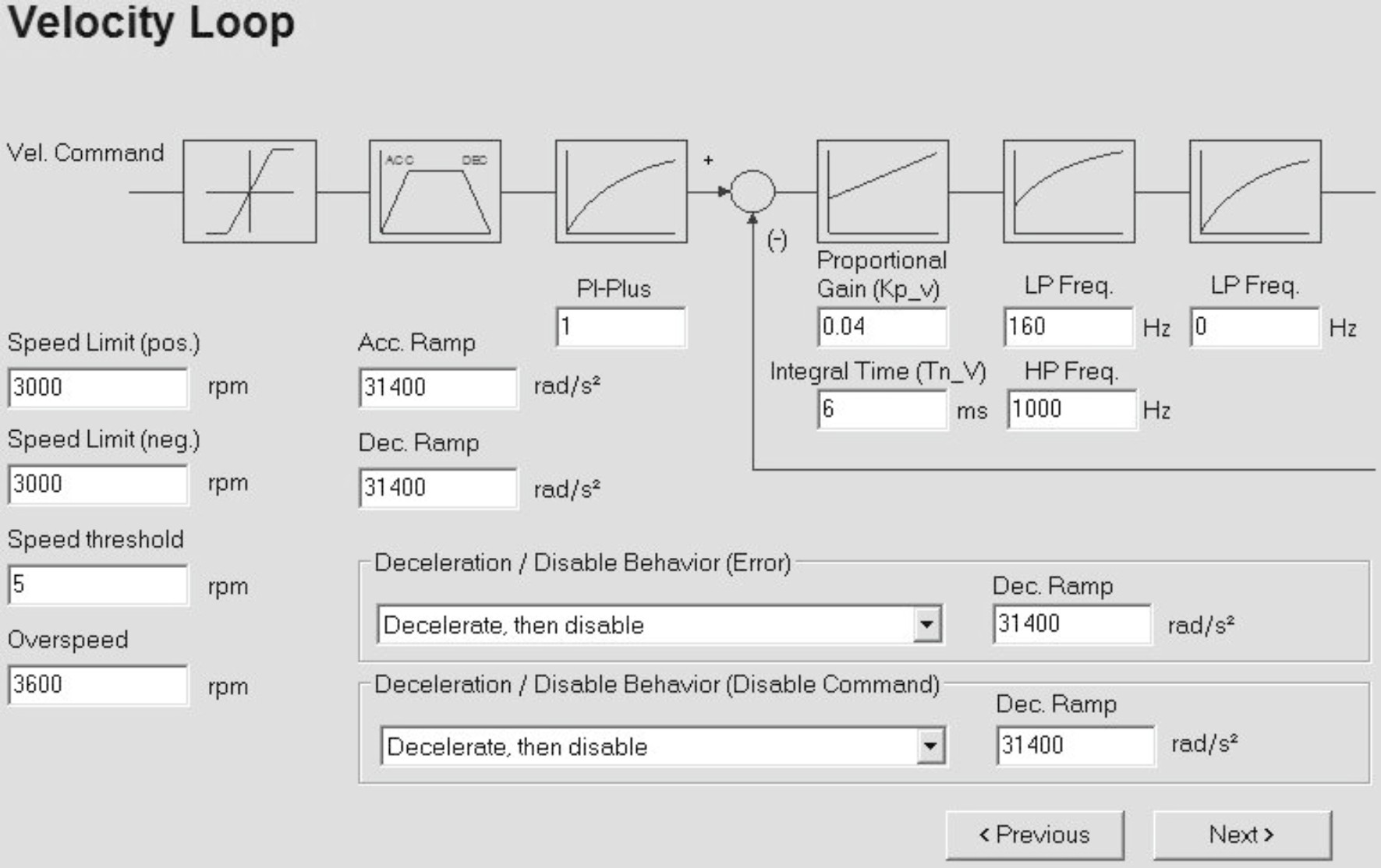 Parameters for tuning the velocity loop. Usually changes are not necessary, if the motor dataset is correct.