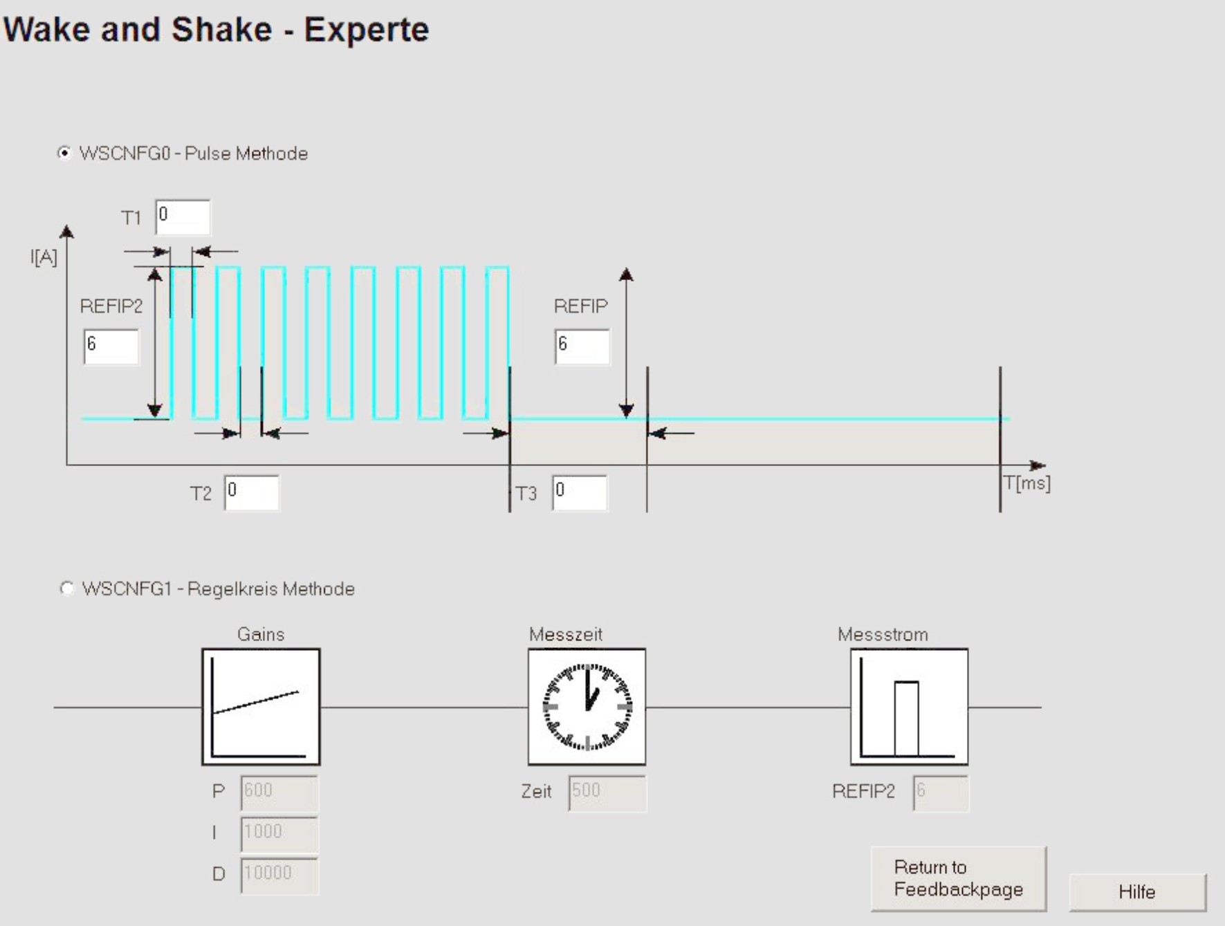Wake and Shake wird benutzt für Feedbacksysteme ohne Kommutierungssignale, z.B. HALL oder eine Sinus/Cosinus Geber. Auf dieser Bildschirmseite können Experten den Wake&Shake Ablauf einstellen.
