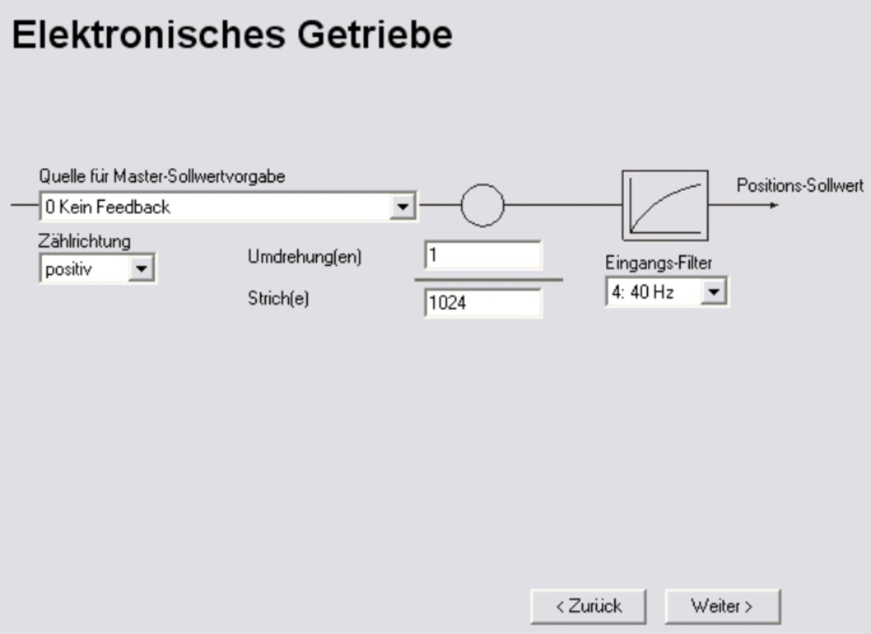 Wenn der Servoverstärker als Slave einer Sollwertvorgabe folgen soll, können Sie hier die Sollwertquelle wählen und eine Übersetzung einstellen.