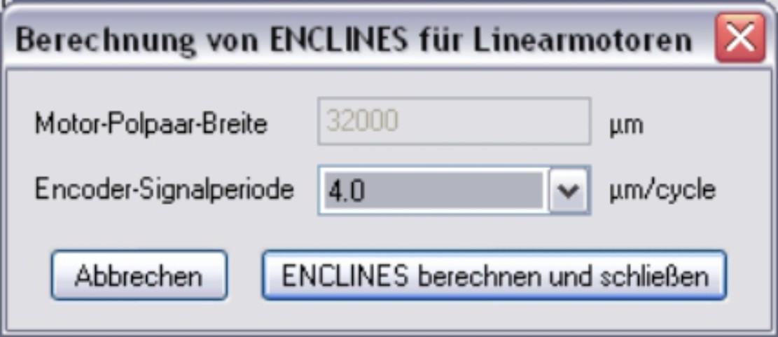 Tragen Sie die Encoder-Signalperiode ein und klicken Sie auf "ENCLINES berechnen und schließen". Der berechnete Wert wird für den ASCII Parameter ENCLINES verwendet.