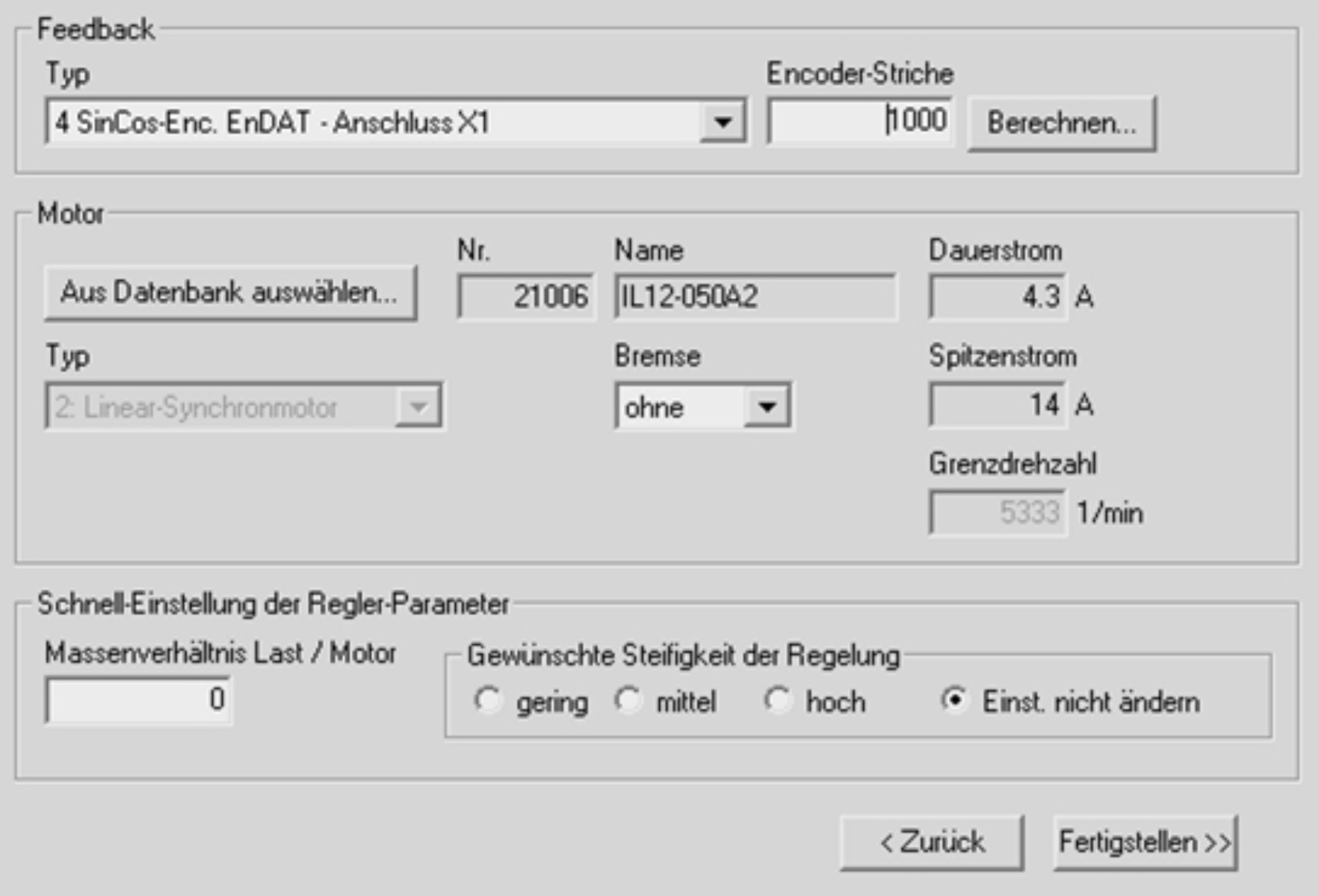 Wenn ein Linearmotor gewählt wird, werden obige Felder angezeigt.