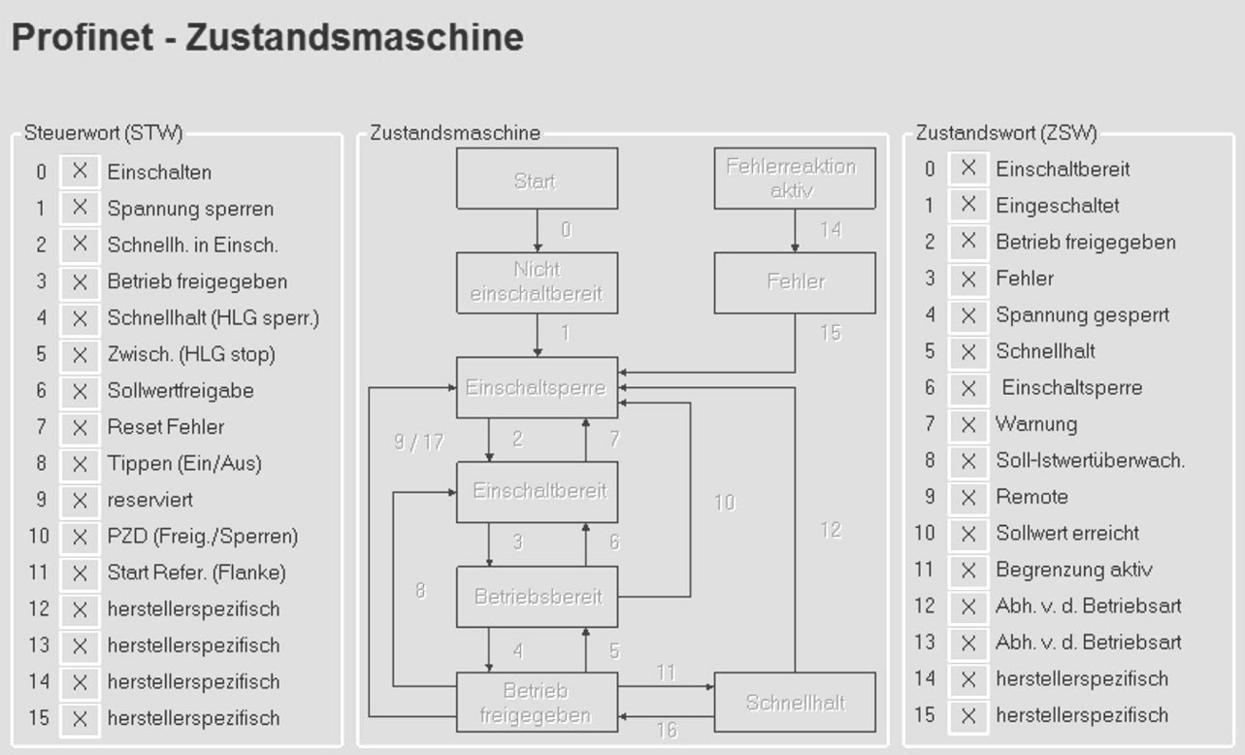 Auf dieser Bildschirmseite werden die Bit-Zustände des Steuerwortes (STW) und des Zustandswortes (ZSW) angezeigt. Der sich aus dem Zustandswort ergebende Gerätezustand wird in der Zustandsmaschine visualisiert. Der aktuelle Zustand wird schwarz dargestellt, alle anderen Zustände grau. Zusätzlich wird der vorherige Zustand durch Hervorhebung der Nummer des entsprechenden Pfeils visualisiert.