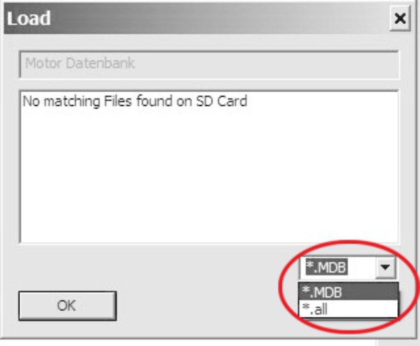 In diesem Beispiel wurde die Komponente MDB (Motordatenbank) gewählt, die Speicherkarte enthält jedoch keine Datei mit der Endung ".MDB". Klappen Sie in solchen Fällen die Auswahlliste für den Dateityp heraus und wählen Sie "*.all*. Jetzt werden alle auf der Karte verfügbaren Dateien angezeigt. Wählen Sie die gewünschte Datei an und Klicken Sie auf OK. Die Daten werden nun in den Servoverstärker geladen. Werden keine Daten angezeigt, stellen Sie sicher, dass die Karte mit FAT32 Dateityp formatiert wurde. |