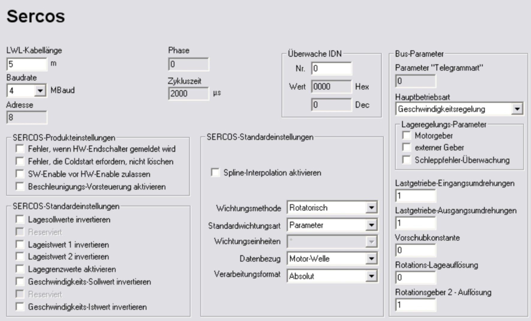 Konfigurieren der SERCOS Schnittstelle für einwandfreie Kommunikation mit dem Master. Geben Sie die Kabellänge ein (max. 45m, wichtig für die optische Leistung) und stellen Sie die Baudrate ein (siehe Installationshandbuch des Servoverstärkers oder SERCOS Dokumentation).