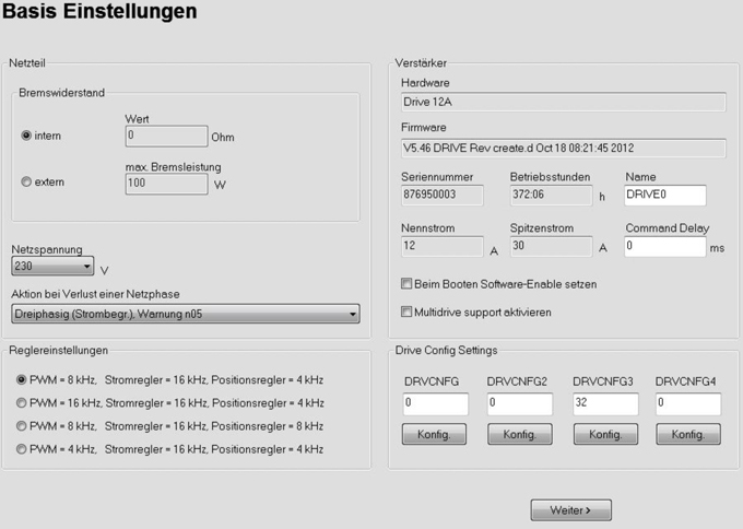 Die Software prüft die vorhandenen Schnittstellen. Wird ein angeschlossener Servoverstärker erkannt, startet die Software mit dem Startbildschirm. Wenn die Multilink Funktionalität eingeschaltet ist (MDRV=1) wird eine Liste der erkannten Servoverstärker im Mehrachsensystem angeboten.