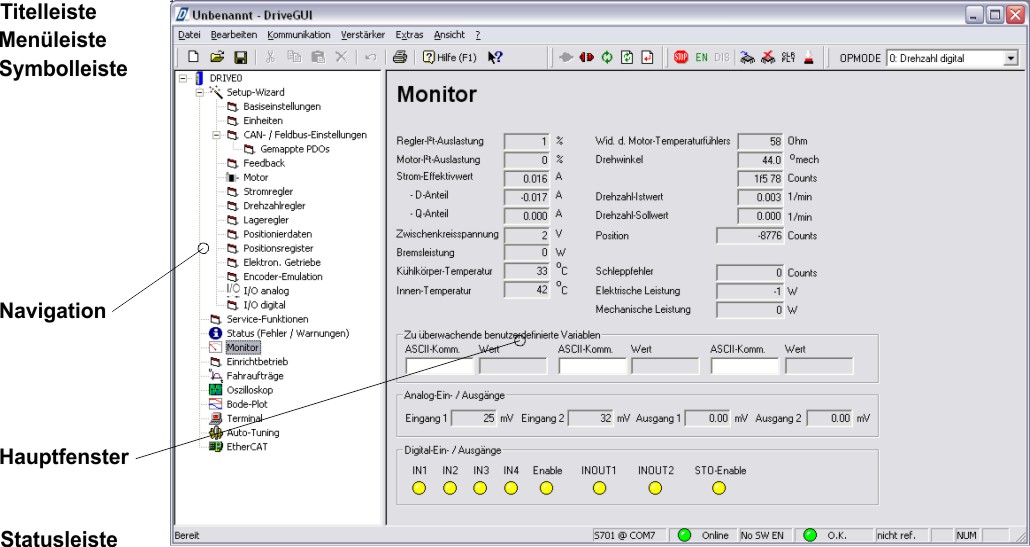 Links wird der Status der Kommunikation zwischen Servoverstärker und Inbetriebnahmesoftware angezeigt. In der rechten Hälfte der Statuszeile werden der Betriebszustand der Software (Online/Offline) und verschiedene andere Zustände des Servoverstärkers gemeldet.