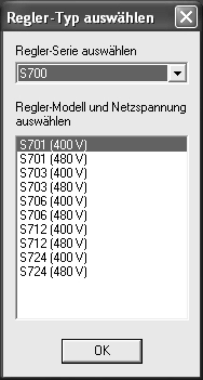 Die Software kann im Offline Modus nicht erkennen, für welchen Servoverstärkertyp Sie Parameter einstellen wollen. Daher müssen Sie zunächst Ihren Verstärkertyp festlegen. Wählen Sie aus der angezeigten Liste die Datenreihe, die für Ihr Gerät und die Netzsituation zutrifft. Alle sinnvollen Kombinationen aus Dauerstrom und Netzspannung sind vorgegeben. Klicken Sie danach auf OK. Die nun geladenen Default-Daten können bearbeitet und in eine Datei abgespeichert werken. |