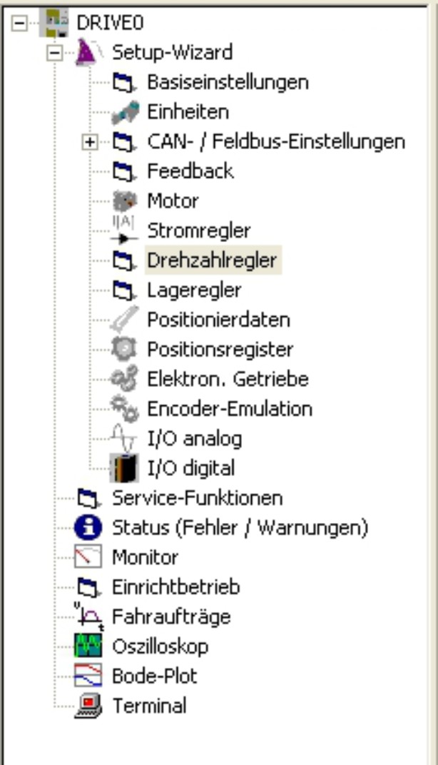 In einer Windows-Explorer ähnlichen Struktur finden Sie Links zu allen Bildschirmseiten, die Sie für Inbetriebnahme, Optimierung und Beobachtung des Servoverstärkers benötigen. Die hier angewählte Seite wird im Hauptfenster dargestellt. Die oberste Ebene des Verzeichnisbaumes trägt den Namen des Verstärkers (im Beispiel DRIVE0). |