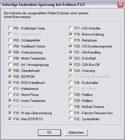 Zur Festlegung, welche Fehlermeldung zum sofortigen Abschalten der Endstufe führen (Bitvariable ERRCNFG, siehe auch Kapitel Fehlermeldungen ) klicken Sie auf die Schaltfläche "Sofortige Endstufen-Sperrung bei Fehlern Fxx.."
