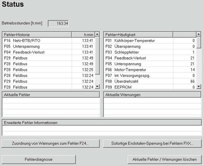 Hier werden der aktuelle Fehlerstatus und der Betriebsstundenzähler des Servoverstärkers angezeigt. Im Vergleich zum aktuellen Stand des Betriebsstundenzählers können Sie leicht ermitteln, wann ein Fehler aufgetreten ist.