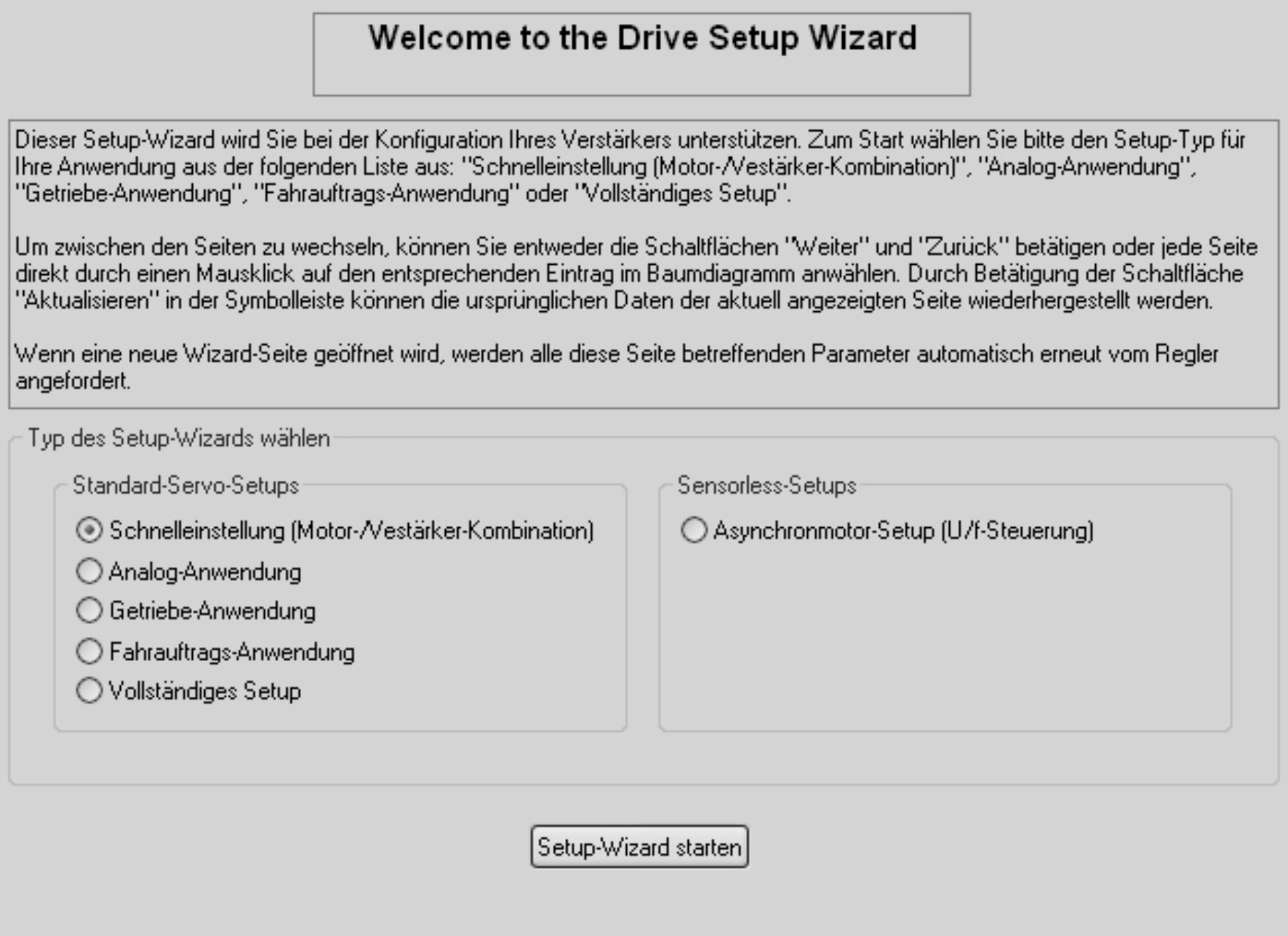 Der Setup-Wizard führt Sie durch die notwendigen Schritte bei der Konfiguration Ihres Servoverstärkers. Abhängig von der zu lösenden Aufgabe werden nur die Bildschirmseiten dargestellt, die benötigt werden. Zum Start wählen Sie bitte den Setup-Typ für Ihre Anwendung aus:
